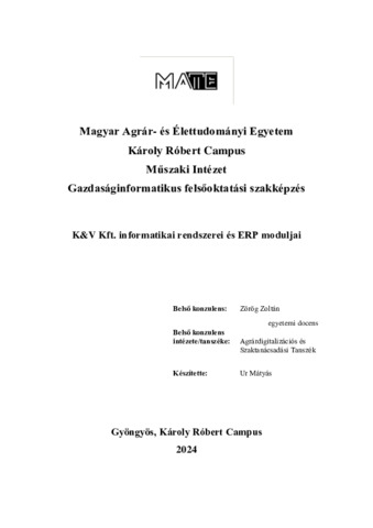 Ur, Mátyás (2024) K&V Kft. informatikai rendszerei és ERP moduljai. Diploma Tézis, Magyar Agrár- és Élettudományi Egyetem.