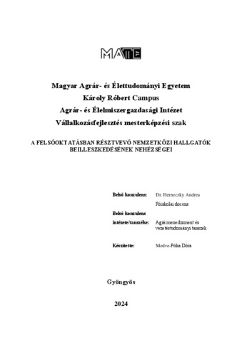 Medve-Póka, Dóra (2025) A felsőoktatásban résztvevő nemzetközi hallgatók beilleszkedésének nehézségei. Diploma Tézis, Magyar Agrár- és Élettudományi Egyetem.