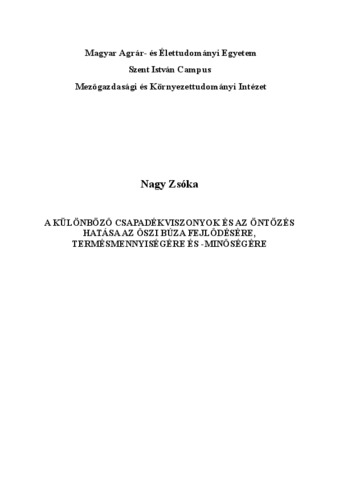 Nagy, Zsóka (2024) A különböző csapadékviszonyok és az öntözés hatása az őszi búza fejlődésére, termésmennyiségére és -minőségére. Diploma Tézis, Magyar Agrár- és Élettudományi Egyetem.