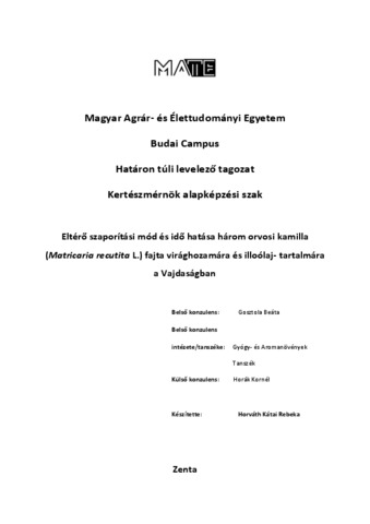 Horváth Kátai, Rebeka (2024) Eltérő szaporítási mód és idő hatása három orvosi kamilla (Matricaria recutita L.) fajta virághozamára és illóolaj-tartalmára a Vajdaságban. Diploma Tézis, Magyar Agrár- és Élettudományi Egyetem.