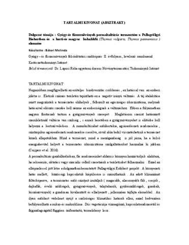 Bátori, Melinda (2025) Gyógy-és fűszernövények permakultúrás termesztése a Pallagvölgyi Biokertben, a kerti- és magyar kakukkfű (Thymus vulgaris, Thymus pannonicus ) elemzése. Diploma Tézis, Magyar Agrár- és Élettudományi Egyetem.