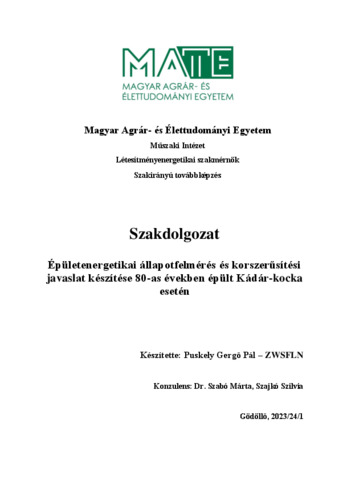 Puskely, Gergő Pál (2024) Épületenergetikai állapotfelmérés és korszerűsítési javaslat készítése 80-as években épült Kádár-kocka esetén. Diploma Tézis, Magyar Agrár- és Élettudományi Egyetem.