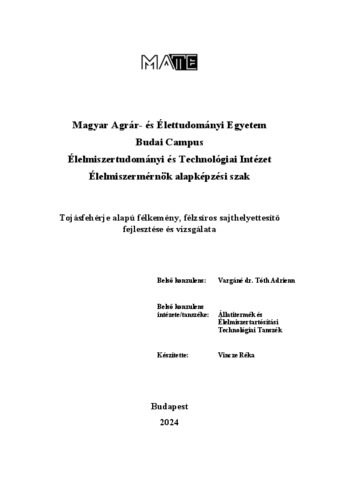 Vincze, Réka (2024) Tojásfehérje alapú félkemény, félzsíros sajthelyettesítő fejlesztése és vizsgálata. Diploma Tézis, Magyar Agrár- és Élettudományi Egyetem.