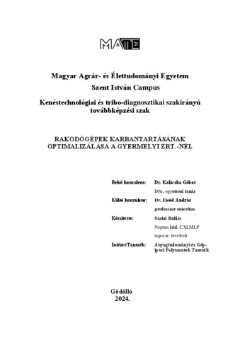 Szalai, Balázs (2024) Rakodógépek karbantartásának optimalizálása a Gyermelyi Zrt.-nél. Diploma Tézis, Magyar Agrár- és Élettudományi Egyetem.