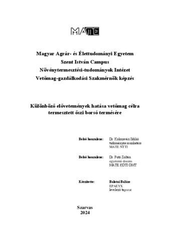 Balotai, Balázs (2024) Különböző elővetemények hatása vetőmag célra termesztett őszi borsó termésére. Diploma Tézis, Magyar Agrár- és Élettudományi Egyetem.