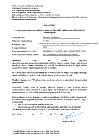 Klenczner, Tamás Áron (2025) Underwater Trails: Balancing Tourism and Conservation in Freshwater Conditions. Diploma Tézis, Magyar Agrár- és Élettudományi Egyetem.