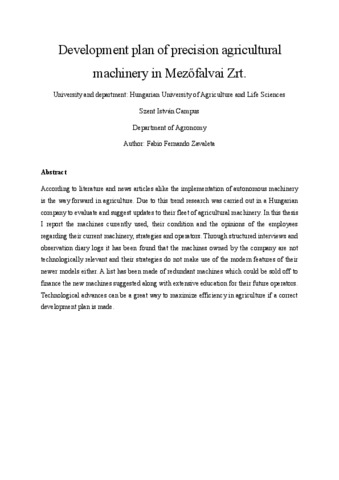 Zavaleta, Fabio Fernando (2024) Development plan of precision agricultural machinery in Mezőfalvai Zrt. Diploma Tézis, Magyar Agrár- és Élettudományi Egyetem.