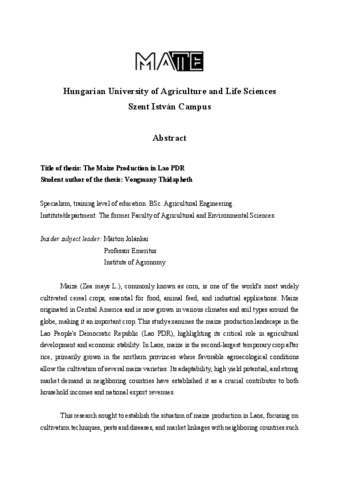 Vongmany, Thidapheth (2024) The Maize Production in Lao PDR. Diploma Tézis, Magyar Agrár- és Élettudományi Egyetem.
