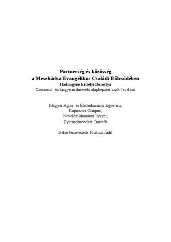 Hadnagyné Erdélyi, Dorottya (2024) Partnerség és közösség a Mesebárka Evangélikus Családi Bölcsődében. Diploma Tézis, Magyar Agrár- és Élettudományi Egyetem.