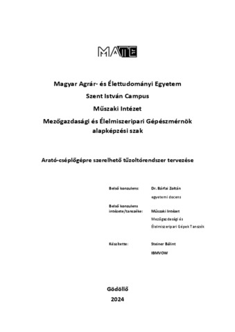 Steiner, Bálint (2024) Arató-cséplőgépre szerelhető tűzoltórendszer tervezése. Diploma Tézis, Magyar Agrár- és Élettudományi Egyetem.
