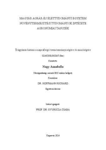 Nagy, Annabella (2024) Trágyázás hatása a napraforgó termésmennyiségére és minőségére. Diploma Tézis, Magyar Agrár- és Élettudományi Egyetem.