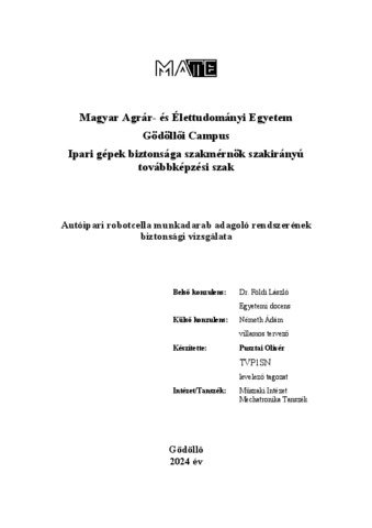 Pusztai, Olivér (2024) Autóipari robotcella munkadarab adagoló rendszerének biztonsági vizsgálata. Diploma Tézis, Magyar Agrár- és Élettudományi Egyetem.