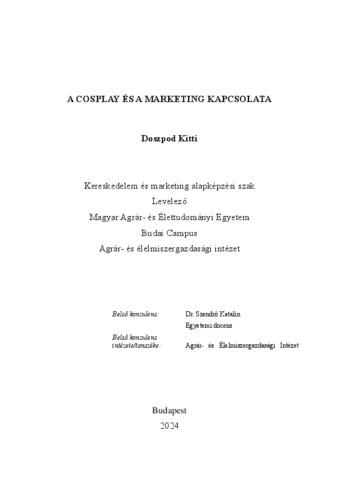 Doszpod, Kitti (2024) A COSPLAY ÉS A MARKETING KAPCSOLATA. Diploma Tézis, Magyar Agrár- és Élettudományi Egyetem.