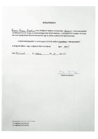 | Közreműködők: | Közreműködés jellege Név Neptunkód E-mail Konzulens Nyitrainé Sárdy, Diána Ágnes ZAJM45 - |