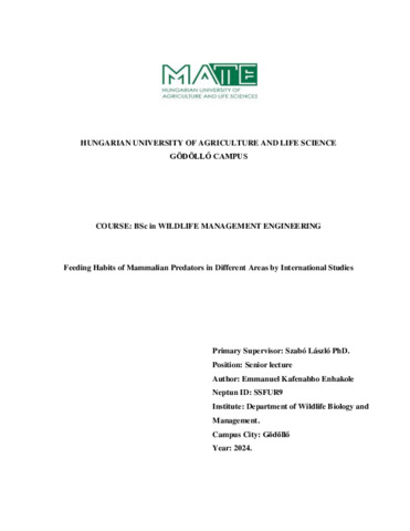 Enhankole, Emmanuel Kafenabho (2024) Feeding Habits of Mammalian Predators in Different Areas by International Studies. Diploma Tézis, Magyar Agrár- és Élettudományi Egyetem.