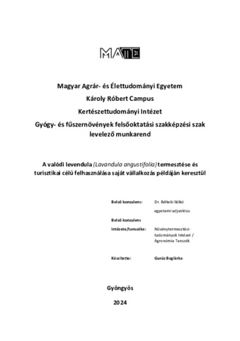Gurúz, Boglárka (2024) A valódi levendula (Lavandula angustifolia) termesztése és turisztikai célú felhasználása saját vállalkozás példáján keresztül. Diploma Tézis, Magyar Agrár- és Élettudományi Egyetem.